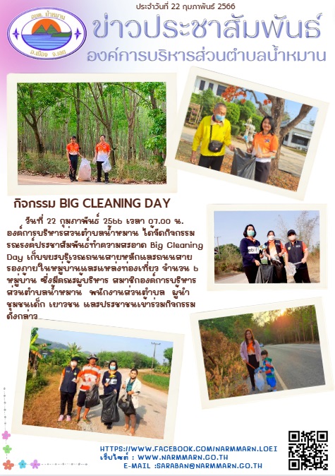 วันที่ 22 กุมภาพันธ์ 2566 เวลา 07.00 น. องค์การบริหารส่วนตำบลน้ำหมาน ได้จัดกิจกรรมรณรงค์ประชาสัมพันธ์ทำความสะอาด Big Cleaning Day เก็บขยะบริเวณถนนสายหลักและถนนสายรองภายในหมู่บ้านและแหล่งท่องเที่ยว จำนวน 6 หมู่บ้าน ซึ่งมีคณะผู้บริหาร สมาชิกองค์การบริหารส่วนตำบลน้ำหมาน พนักงานส่วนตำบล ผู้นำชุมชนเด็ก เยาวชน และประชาชนเข้าร่วมกิจกรรมดังกล่าว