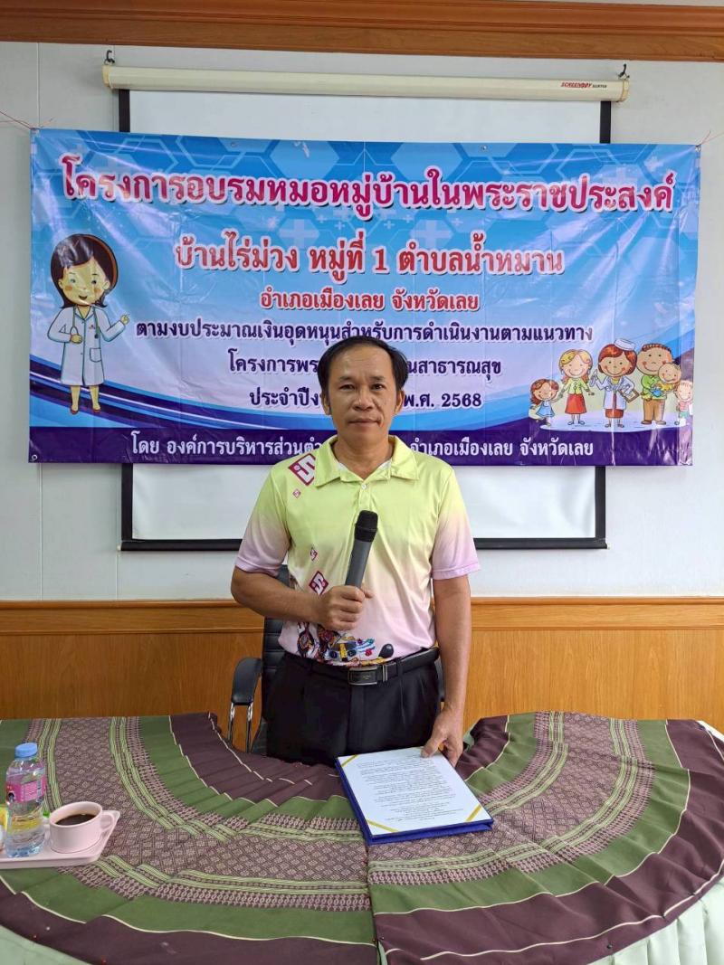 รายละเอียด : เมื่อวันที่ 17 กันยายน 2568 เวลา 09.00 น. องค์การบริหารส่วนตำบลน้ำหมานได้จัดโครงการพระราชดำริด้านสาธารณสุข โครงการอบรมหมอหมู่บ้านในพระราชประสงค์ บ้านไร่ม่วง หมู่ที่ 1โดยมีนายประวิน อินทะบุญศรี นายกองค์การบริหารส่วนตำนลน้ำหมาน เป็นประธาน กล่าวเปิดโครงการ ณ ห้องประชุม รพ.สต.ไร่ม่วง ตำบลน้ำหมาน อำเภอเมืองเลย จังหวัดเลย