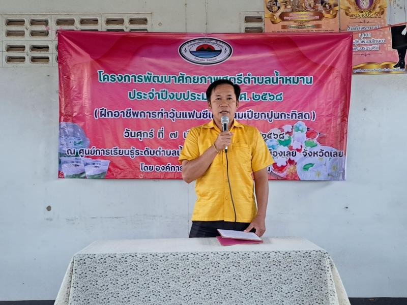 รายละเอียด : เมื่อวันที่ 7 มีนาคม 2568 เวลา 08.30 น. องค์การบริหารส่วนตำบลน้ำหมาน ได้จัดทำโครงการพัฒนาศักยภาพสตรีตำบลน้ำหมาน ประจำงบประมาณ พ.ศ.2568 ฝึกอาชีพการทำวุ้นแฟนซีและขนมเปียกปูนกะทิสด โดยมีนายประวิน อินทะบุญศรี นายกองค์การบริหารส่วนตำบลน้ำหมาน เป็นประธานกล่าวเปิดโครงการ ซึ่งมี คณะผู้บริหาร นางสาวพนารัตน์ วงษ์ชมภู ปลัดองค์การบริหารส่วนตำบลน้ำหมาน สมาชิกสภาองค์การบริหารส่วนตำบลน้ำหมาน หัวหน้าส่วนราชการ พนักงาน ประชาชนตำบลน้ำหมาน เข้าร่วมโครงการ ณ ศูนย์การเรียนรู้ระดับตำบลน้ำหมาน (ศกร.) อำเภอเมืองเลย จังหวัดเลย