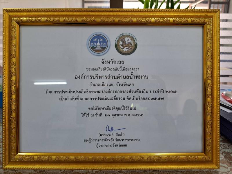 ซึ่งองค์การบริหารส่วนตำบลน้ำหมานได้ผลการประเมินเฉลี่ยรวม คิดเป็นร้อยละ 95.57 เป็นลำดับที่ 2 ของจังหวัดเลย ณ ห้องประชุมศรีสองรัก ชั้น 5 ศาลากลางจังหวัดเลย