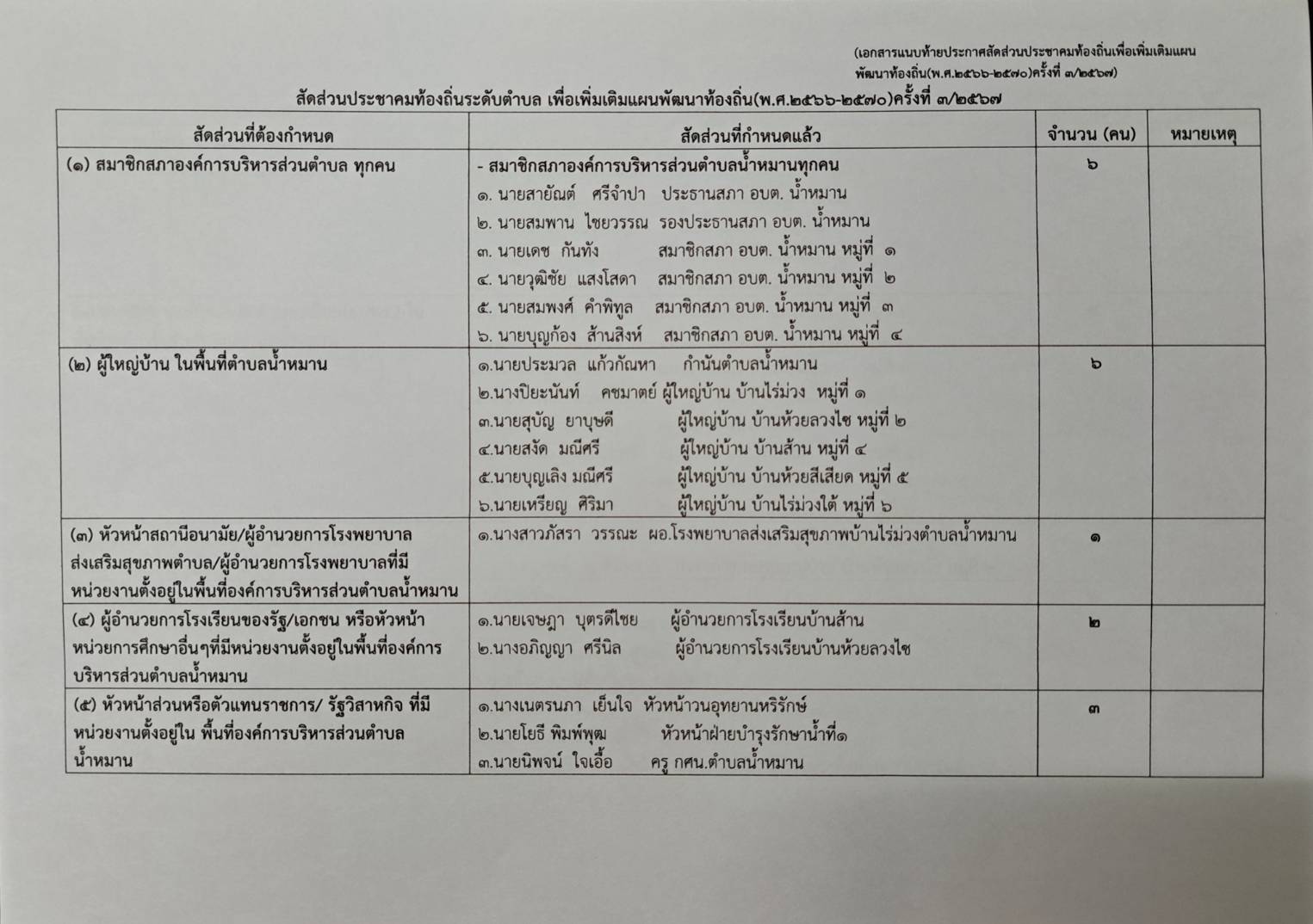 เรื่อง การจัดประชุมประชาชมท้องถิ่นระดับตำบล เพื่อเพิ่มเติมแผนพัฒนาท้องถิ่น (พ.ศ.2566-2570) ครั้งที่ 3/2567 และ เรื่อง สัดส่วนประชุมประชาคมท้องถิ่นระดับตำบล เพื่อเพิ่มเติมแผนพัฒนาท้องถิ่น (พ.ศ.2566-2570) ครั้งที่ 3/2567