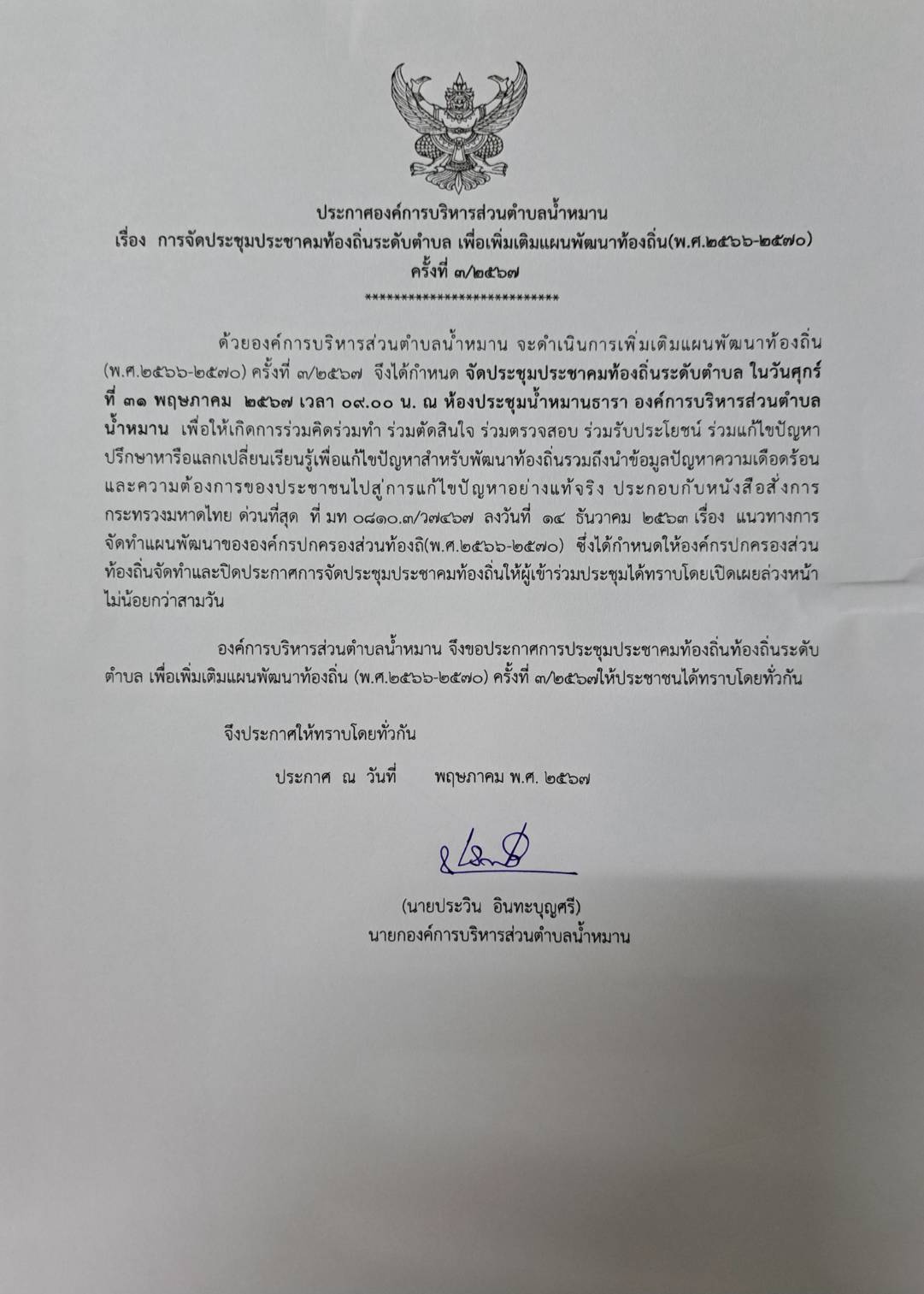 ประกาศองค์การบริหารส่วนตำบลน้ำหมาน เรื่องการจัดประชุมประชาคม และสัดส่วนประชุมประชาคม